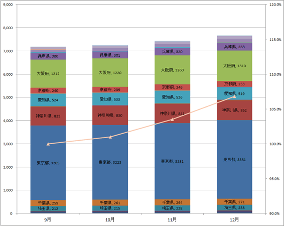 4) 都道府県別 車両台数推移(主要6社 2012.10~2012.12)